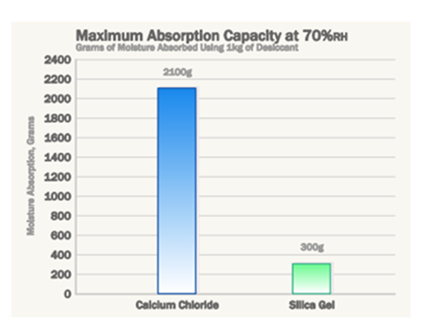 At 25 degrees Celsius and 70% relative humidity, calciumchloride absorbs seven times as much water as silica gel.