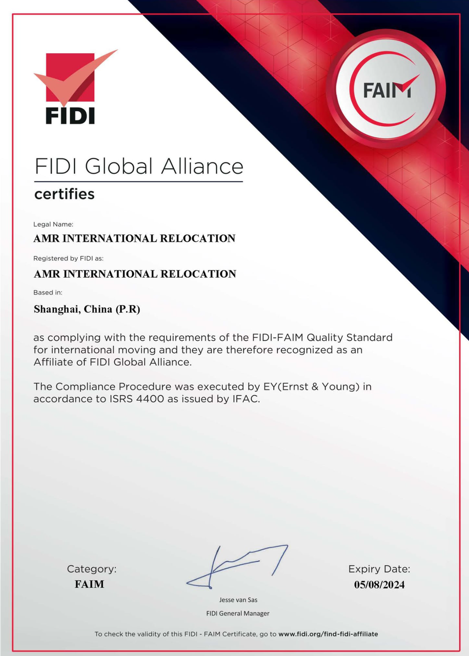 We are thrilled to announce that FIDI Global Alliance has awarded the FAIM Certification to AMR International Relocation on the 9th September 2021 in recognition of full compliance with the stringent FAIM Standard requirements. The FAIM Certification is the world’s first and only quality assessment program for the international moving & relocation industry. Every FAIM certified company has to go through regular audits performed by independent auditors from Ernst & Young. Following their successful audit on the 5th August 2021, AMR was awarded the FAIM quality label.This is a milestone for AMR. It assures the client that AMR is always aligned with providing the highest standard of service and therefore brings our clients the best moving experience. This is just the beginning: AMR is working non-stop to provide consistent high-end service.We want to thank our Shanghai team. Congratulations! This award is well-earned through your dedication.AMR was founded in 2015. We serve about 600 families moving in and out of China annually and operate in Shanghai, Beijing and Taipei.FIDI is the largest global alliance of international moving and relocation companies, with members in over 100 countries. All FIDI affiliated companies have one thing in common: their high level of quality service - and they can prove it.